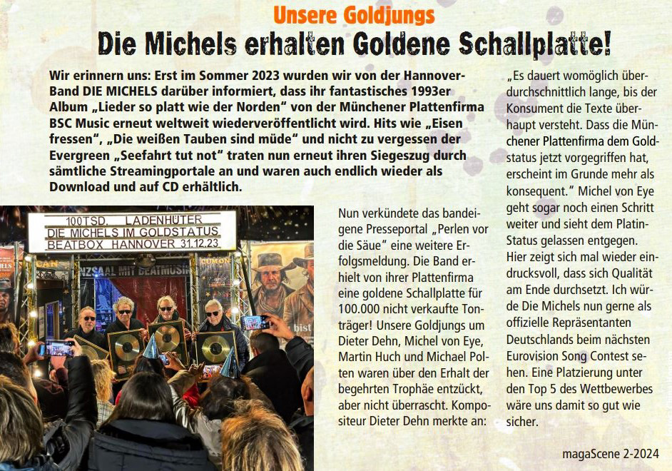 Wir freuen uns, wieder einmal eine Goldene Schallplatte überreichen zu können, diesmal an die Michels für ein Album, das bereits gute 30 Jahre alt ist und derzeit ein Comeback auf allen digitalen Plattformen erlebt. Unser Glückwunsch geht nach Hannover!